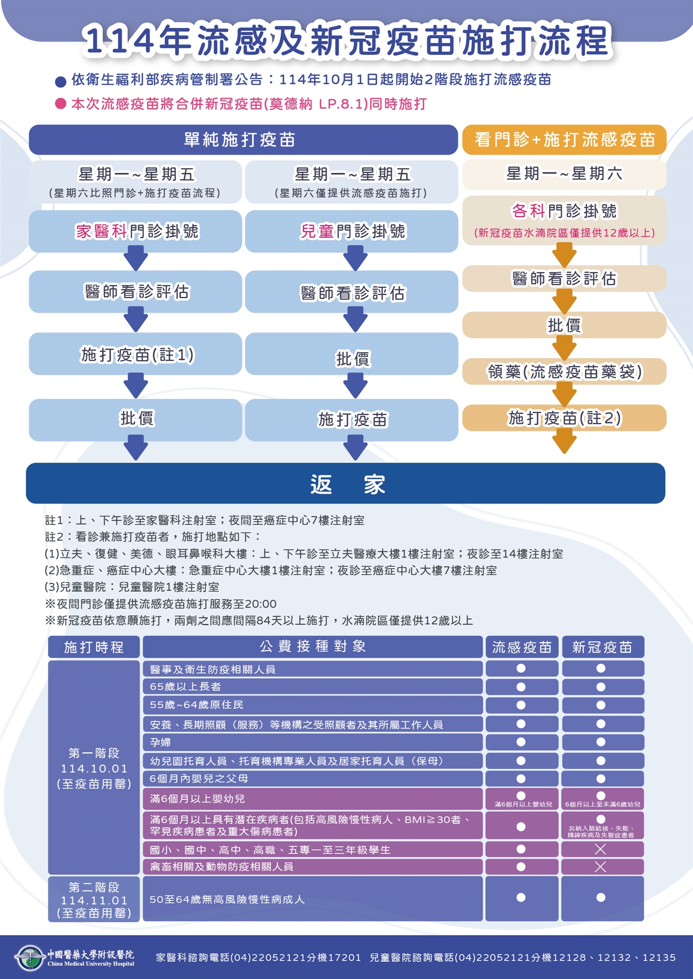 114年10月1日起開始2階段施打流感疫苗 本次流感疫苗將合併新冠疫苗(莫德納 LP.8.1)同時施打