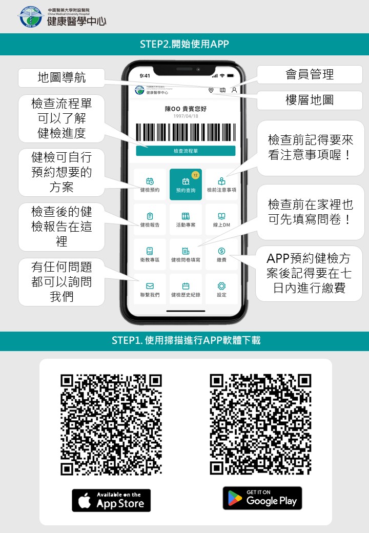 為讓健檢更順暢、更環保,建議您在報到前先下載「中國醫智慧健檢APP」即可: