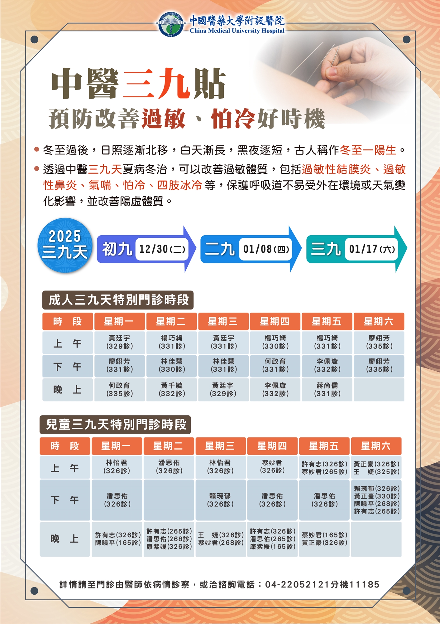中國醫藥大學附設醫院中醫團隊關心您的健康,期待為您提供最專業的醫療服務,共同迎接溫暖健康的冬天!