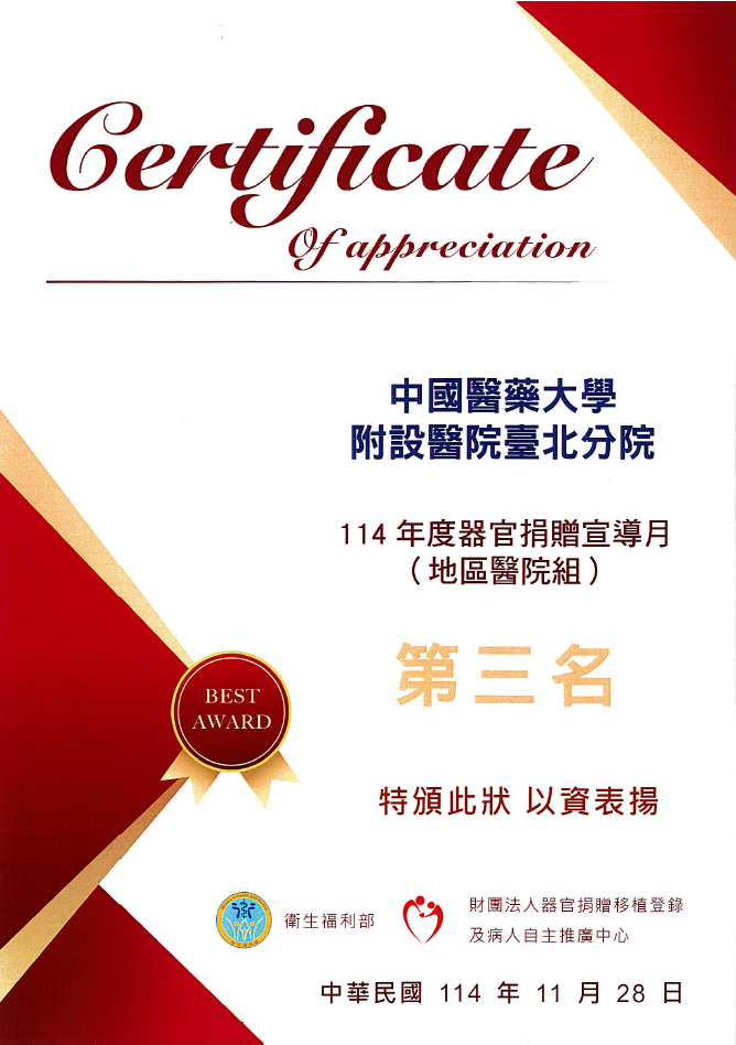本院榮獲114年器官捐贈宣導月地區醫院組第三名