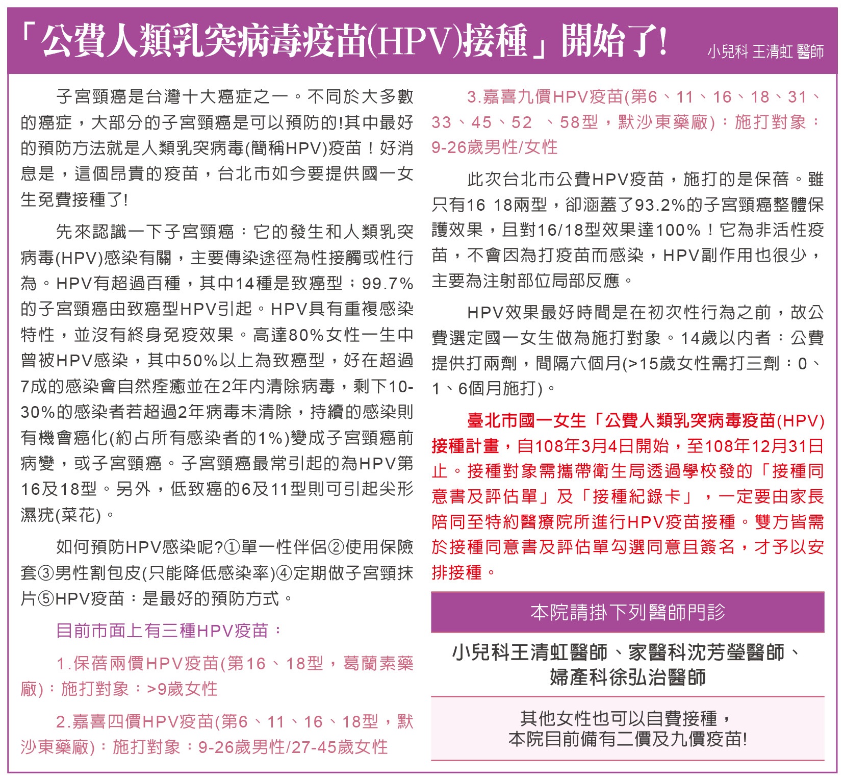 「公費人類乳突病毒疫苗(HPV)接種」開始了! 2019-04