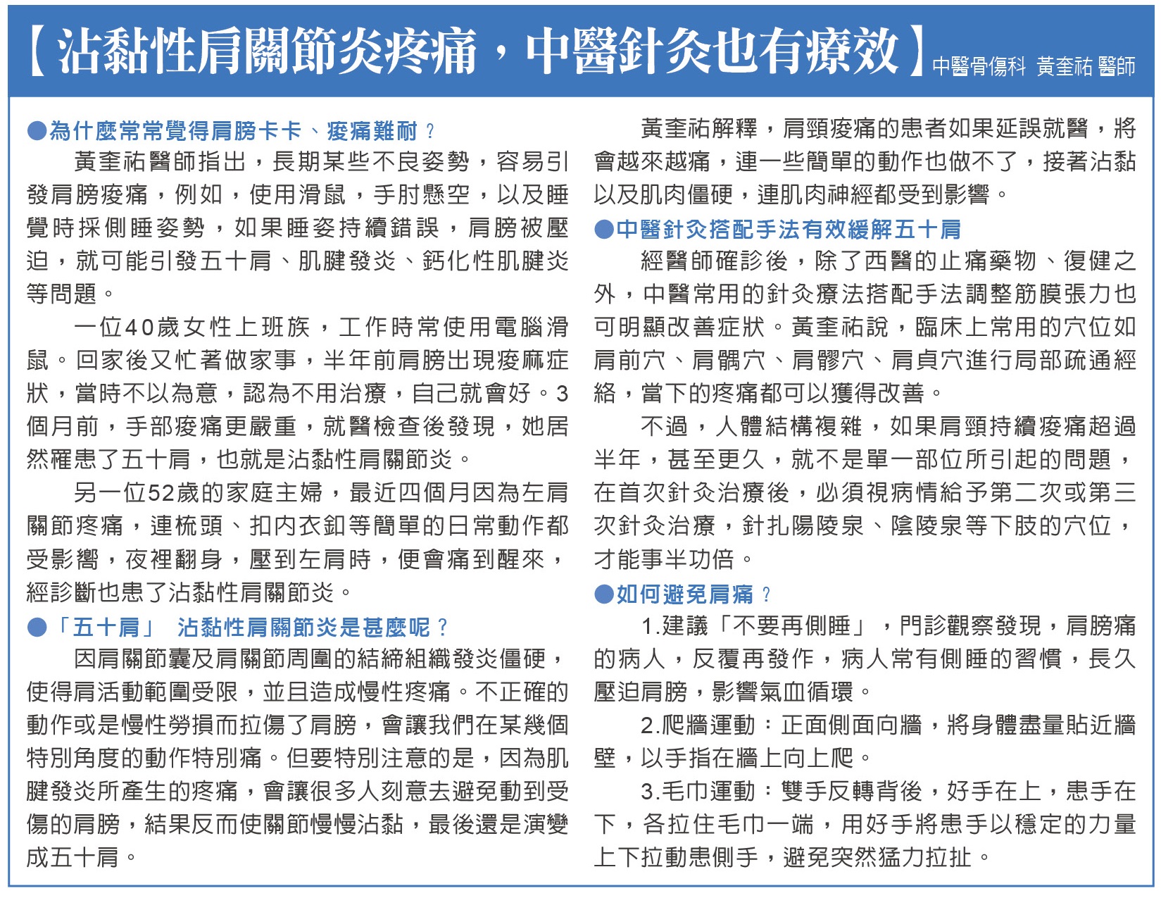 沾黏性肩關節炎疼痛,中醫針灸也有療效 2019-04