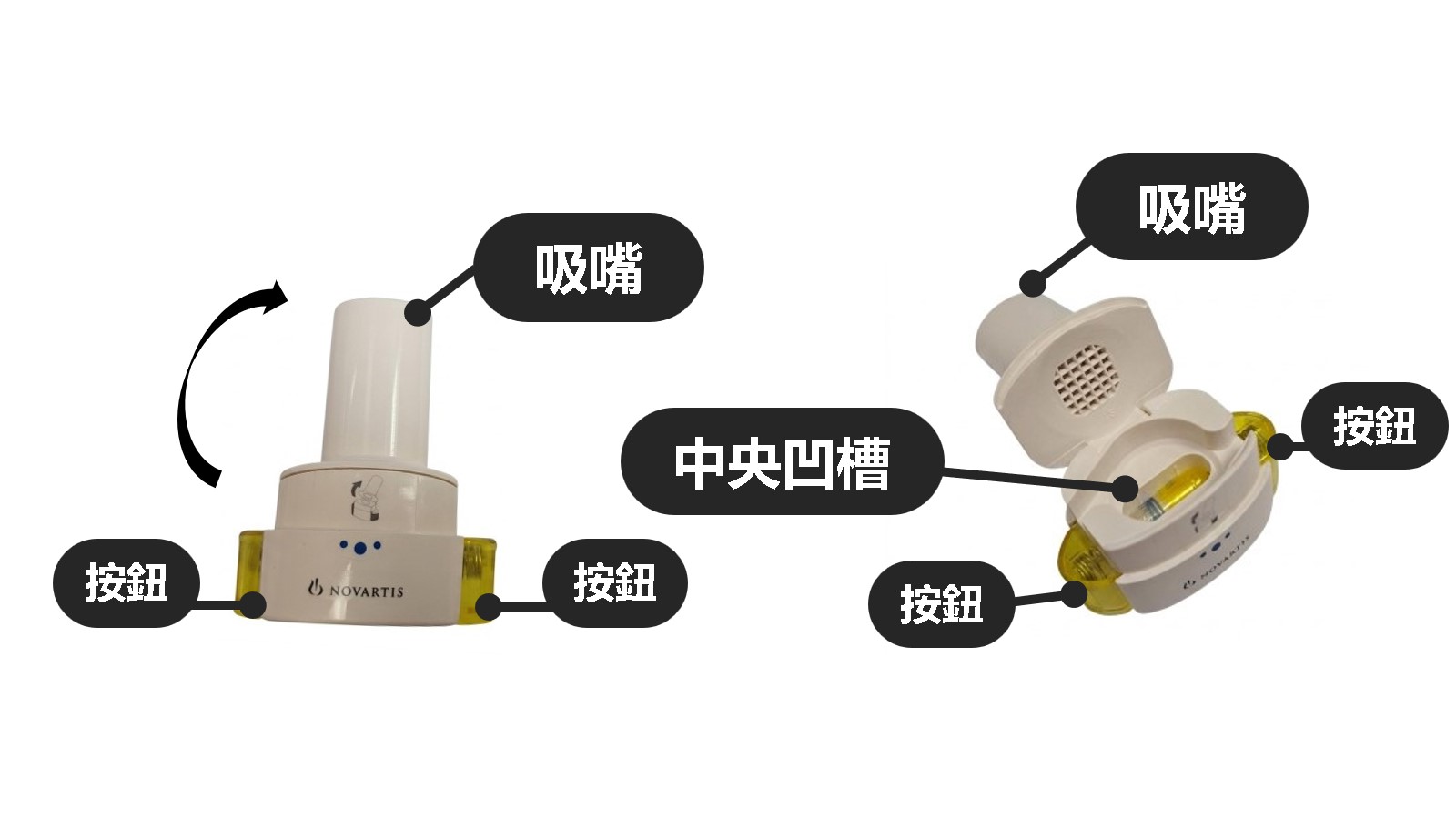 - 先拔開帽蓋,完全打開吸入器,露出中央凹槽。
