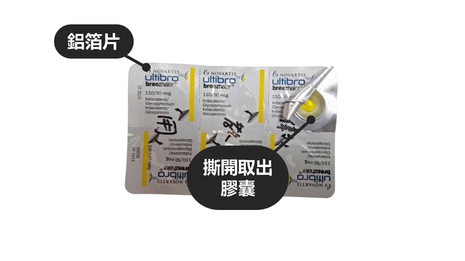 - 撕開鋁箔片並取出膠囊,放置於吸入器中央凹槽內 (如附圖),再蓋上吸入器,蓋上時會聽到喀擦聲。