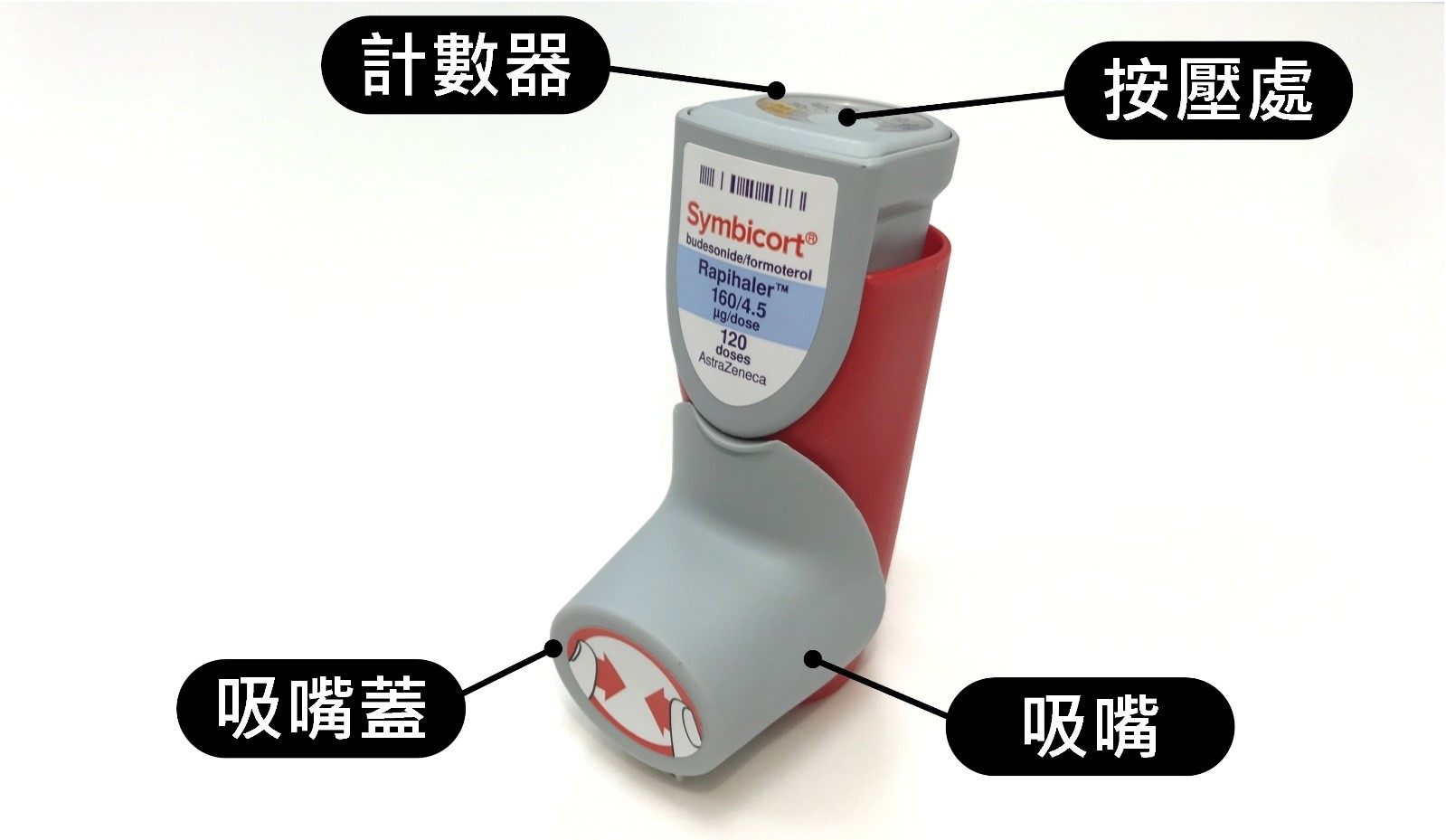- 吸藥完畢後請將吸嘴蓋蓋回,並務必以清水漱口,且嗽口後將水吐出,以減少口腔感染風險。