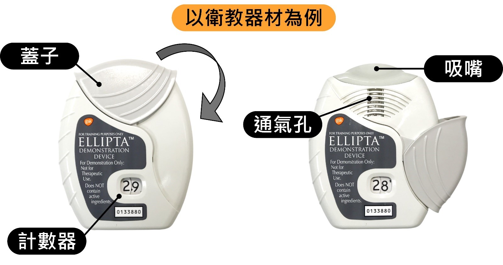 - 吸入器蓋子要使用時再打開,若打開蓋子卻沒有吸藥,將損失一次劑量。