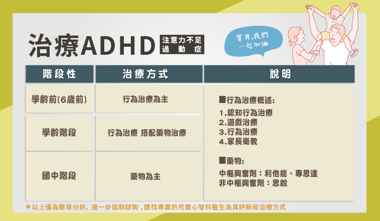 詢問林秀縵醫師,通常治療ADHD的孩子,在不同階段醫師給予的方法皆不同,爸媽不需過度擔心小小孩會在一開始就進入藥物治療的環節。治療的黃金時期,建議越早越好,建議不以超過國小三年級較佳,避免在學習階段會落差同齡者太多,導致孩子喪失自信心或不容易與同儕建立良好的互動關係。