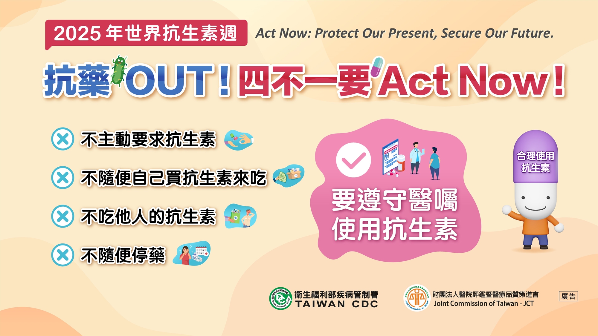 2.今年WHO主題「立即行動,守護當下;保障未來」,全民攜手阻止抗藥性蔓延,齊心以「防疫一體」之概念,共同攜手合作落實抗生素管理及感染管制。