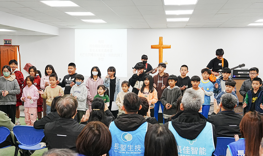 孩子們以捐贈的樂器組成小樂團,在前方合唱演出,純真的歌聲傳遞感謝,也象徵一路上有善心企業與社會力量陪伴成長。