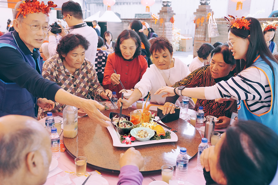 中醫大附醫企業志工及衍生企業夥伴陪同長輩圍桌用餐、交流互動。