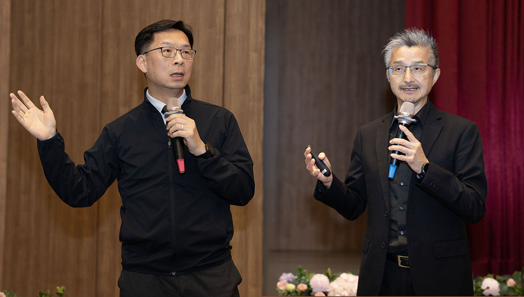 AI暨機器人創新中心主任張詩聖(左)主任說明「AI Agents:智慧醫療轉型的新引擎」,馮文生主任(右)提及「HiThings Tele-ICU智匯海重症戰情室:重症照護的現在與未來」